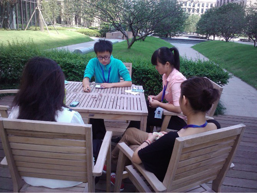 图为百度企业党小组在公司研发园区一角组织讨论会