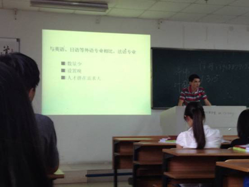 人文系法语教研室主任朱浩然随后对2012级新生做了法语应用专业的专业学习教育,他以详实的数据,广阔的视野,及客观的分析,向同学们介绍了法语专业的由来、构成、学习特点、方法及适用领域、就业前景等,为同学们增强专业学习动力,了解专业发展前景及职业方向等,提供了正确的引导。在随后举行的各班主题班会上,同学们表示要认真学习,诚实做人,展现个性,成人成才。
