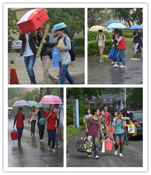 14日下午的校园装饰一新,散发着喜悦和温暖的氛围。虽然第二天才正式报到,但是学院的迎新和报到工作已经展开。15日是到校学生数量最多的一天,虽然这天天空中下着淅淅沥沥的雨,志愿者们没有丝毫的怨言,风雨中坚持用最亲切和热情的状态迎来学弟学妹们。