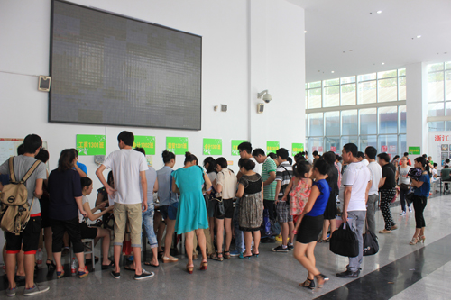 9月3日,我院学院成教学院2013级新生报到在6号楼大厅举行。上午8点不到,就有学生家长根据指示牌的指引来到6号楼前等候办理报到手续。偌大的大厅不一会就挤满了人,学生在志愿者的带领下有序的办理报到手续与入住手续。学院党委副书记、纪委书记、副院长盖庆武,成教学院常务副院长周宗谷,成教学院党支部书记、副院长徐登喜等也来现场视察慰问指导。