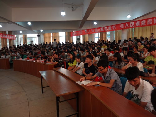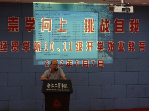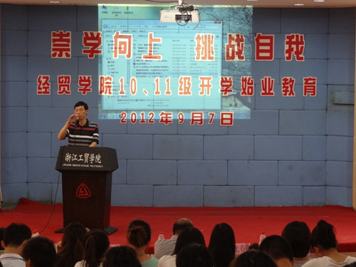 9月7号下午,经贸学院2010、11级在阶梯教室举行以“崇学向上 挑战自我”为主题的开学集中始业教育。经贸学院院长汪焰、党总支书记项光春等老师以及各班班主任、2010、2011级全体在校学生等出席了会议。