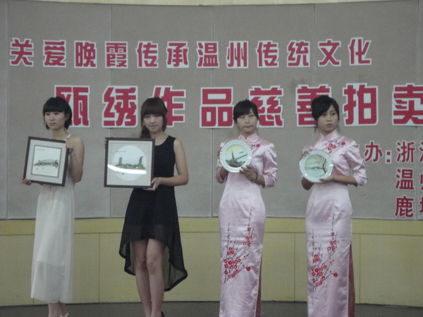 此次公益拍卖会主要以“关爱晚霞,传承温州传统文化”为宗旨,同时将慈善与传承传统文化完美结合,在文化传承的同时,帮助了一批需要帮助的人,让此次拍卖会变得更有意义。此次拍卖的作品更是意义非凡,它们是由我院团委、传统工艺美术研究所瓯绣工作室联合温州都市报推出的免费教中老年人学瓯绣培训课程的40名中老年学员经过2个月学习努力的成果。学习虽辛苦,但大爱更无私,那些和蔼而善良的中老年人虽舍不得他们的努力成果,但为了慈善,为了公益事业,为了帮助更多需要帮助的特殊学校的孩子们,他们毅然地捐出自己幸苦制作2个月的瓯绣作品进行拍卖。