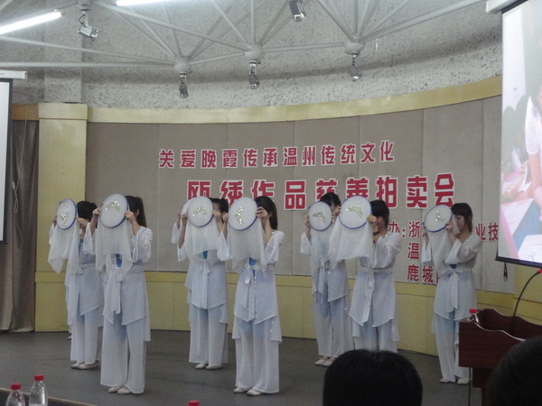 在我院大学生艺术团的舞蹈“瓯绣”带领下。在场的观众走进了瓯绣的世界,领略温州传统文化的独特魅力,拉开了此次慈善拍卖会的序幕。中老年人瓯绣学习班成员王震老师诉说了自己学习的经历,道出了要传承传统文化的艰辛,表示通过作品拍卖的方式,让更多的人包括温州特殊学校的孩子们接触和学习瓯绣艺术。学院模特队同学的优秀作品走秀,展示了瓯绣、瓯塑的独特魅力。