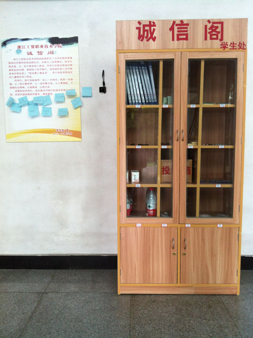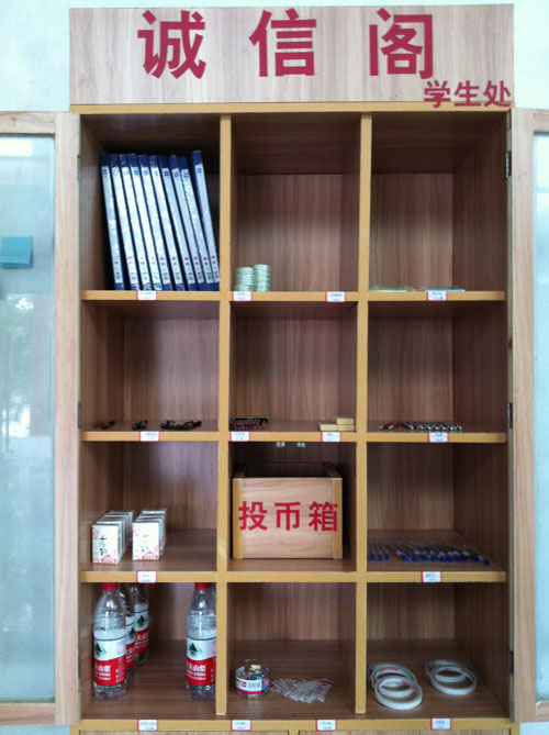近日,我院六号教学楼一楼大厅内多了一台特殊的无人售货机——伟德BETVlCTOR1946诚信阁。打开阁子,里面分为四层,整齐地陈列着矿泉水、餐巾纸、笔记本等小商品,每一件都有明确的标价。学生们可以自助购买里面的商品,给钱、找钱完全靠学生自觉,由此所得的盈利将放入学院“致远爱心基金”,捐给贫困地区的儿童供他们购买学习用品。同时在诚信阁旁边还摆置了10余把诚信伞,免费租借给学生使用,学生在使用完后自觉归放原处。