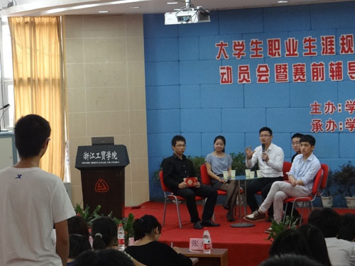 学院举行2012年职业生涯规划比赛的通知刚刚公布,就在工贸学子中间引起了广泛关注。为使准备参加此次比赛的同学能够充分掌握比赛规则、了解比赛特点、把握参赛技巧,为引导大学生树立正确的成长观、择业观和价值观,提高适应社会、与人相处的能力,为使参赛同学能够在学院比赛、省级比赛中充分发挥水平,学院团委主办了“学院第四届职业生涯规划大赛动员暨赛前培训会”。培训会在5月24日下午在阶梯教室举行,培训会邀请到了第三届浙江省职业生涯规划评委夏铭老师、参加2012年浙江省职业生涯规划导师培训的人文系夏耀老师、创业学院杨哲旗老师、浙江省第二届“十佳职业生涯规划之星”张成同学和浙江省第三届“十佳职业生涯规划之星”陈亮亮同学。