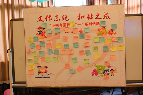 活动过程中与会嘉宾为参加本次“小候鸟圆梦六个一活动”的小朋友们赠送了节日礼物。我院区域文化研究中心沈智毅副教授深入浅出的从温州的历史、建筑、特产、语言等方面为在场的61名小候鸟和他们的家长讲授了《瓯越文化》。让在场的所有人对东瓯文化有了更加透彻更为理性的认识,更让小候鸟对此次圆梦六个一活动的“文化东瓯和融之旅”的主题更加生动明晰。最后小候鸟们将自己的心愿贴纸粘贴在许愿墙上,让理想伴着希望一起飞翔。