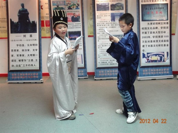 2012年4月22日,由温州团市委希望办主办,学院学社联刘基文化研讨会承办的“走进刘基,让传统文化陪伴你左右”红领巾周末文化活动在温州市青少年活动中心如火如荼地进行。