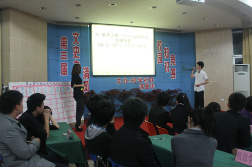4月19日,由校学社联、清墨坊主办的学院第三届大学生“文史之清风”校园知识竞赛在阶梯教室落下帷幕。本次竞赛特邀杨爱华老师、蔡蓉萍老师、商芳老师、蔡景智老师为嘉宾,各院系共有九支队伍参加了此次比赛。