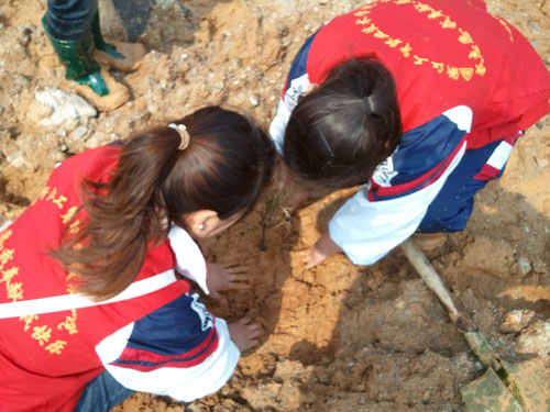 不怕泥泞,克服困难,展现爱与奉献的“红马甲”志愿者精神。因为前一段时间一直下雨,土地比较松软,泥土中还有大大小小的积水区域,“红马甲”志愿者的种植区域又在中间位置,如何进入植树带成了第一个考验。通过交流,志愿者们边走边向路中间垫上石块,前面的同学拉后面的同学,不一会,志愿者们总结出经验,在这样的地形中不能停留,要快速行进才能不陷入泥土里。泥巴沾满了裤脚,江风吹红了脸庞,大家没有怨言,都在到达的第一时间拿起植树工具,在泥泞的土壤中为树苗找个家。瓯江口新区的风比较大,又没有建筑这遮挡,加上这里的土地中沙石含量高、土地泥泞,这为志愿者们种树带来了严峻的考验。志愿者们先用锄头挖出泥中的石块,然后用铁锨挖出泥土,为了树木能更好的成活,志愿者们将树坑尽可能的挖的深一些,脚染土,身沾泥,手刺破都阻挡不了志愿者植绿的决心。有的地方因为混进去很多泥水,用工具很难将泥土填平,同学们就用手去填平泥土。志愿者们的脸上、鞋子上、身上满上泥点,可是乐在脸上,甜在心间。在长达2个小时的志愿时间里,志愿者们克服种种困难,完成了植树任务,将近100棵小树苗有了一个安心的窝。