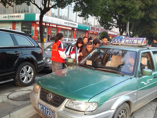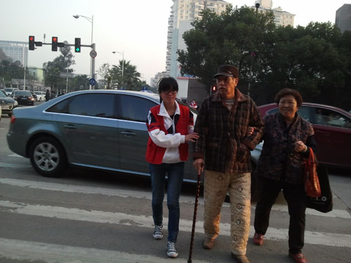 温州市中西医结合医院前的十字路口,车辆行人川流不息、络绎不绝,红绿灯交替闪烁,“人文义工队”队员们分成四个组站于四个路口,劝导驾驶员不违章停车,提醒预备闯红灯的行人稍等,待绿灯亮时再小心慢行。因为是医院附近,常有行动不便的病人或步履蹒跚的老人出现,而此时,“人文义工队”的队员们就会上前帮助他们过马路。到了下班、放学高峰期,马路显得更加热闹非凡。步伐匆匆的白领,行动迟缓的老人、青春活泼的学生在“人文义工队”的指挥下有序地过马路。身着红色志愿者马甲的“人文义工队”成为马路上一道别样的风景线。
