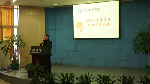 此次的始业教育分为三个阶段。首先由分院潘副院长对上一学期的分院工作做总结,着重2010级学生在外顶岗实习的情况进行了汇总,同时通报了我院学生在各类学科竞赛取得的良好成绩,并对本学期的教学安排作了介绍。