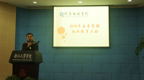 信息传媒学院于2月12日和13日在阶梯教室分别对分院2011级、2010级学生开展春季学期始业教育。分院副院长潘修强,分院党总支副书记林海春,办公室主任杨天化,辅导员及各班班主任和全体同学参加了本次大会。