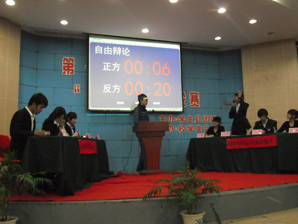 2011年12月21日晚在阶梯教室举行了第十二届大学生艺术节之“谁与争锋”辩论赛总决赛。历时一个多月,经历风采展示、初赛、半决赛、决赛辩、总决赛五轮比拼的赛事落下了帷幕。在总觉赛现场四支过关斩将的优胜队伍再次给工贸学子们带来头脑风暴的体验,总决赛现场犀利与幽默共存,智慧与风度再现;平安校园菁菁学子宏辞论道,谈古论今谁与争锋一争高下。总决赛现场邀请学生处王春柳处长、人文系徐辉副书记、学生处应马忠老师、人文系程震设、周晓玲老师到场担任评委。
