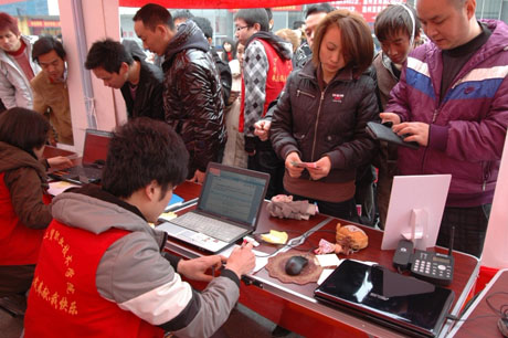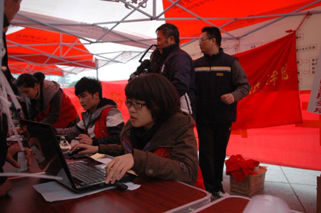 工贸学院红马甲志愿者的“帮助农民工返乡购票服务点”格外的受人欢迎,从上午十点到下午六点,在服务点前排起了长长的队伍,这段时间里大概有200余名在温务工新居民进行登记购票,他们大都是在排队无果的情况下来请志愿者帮忙网络购票。
