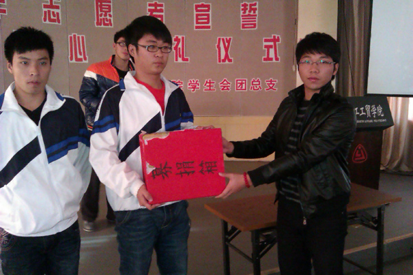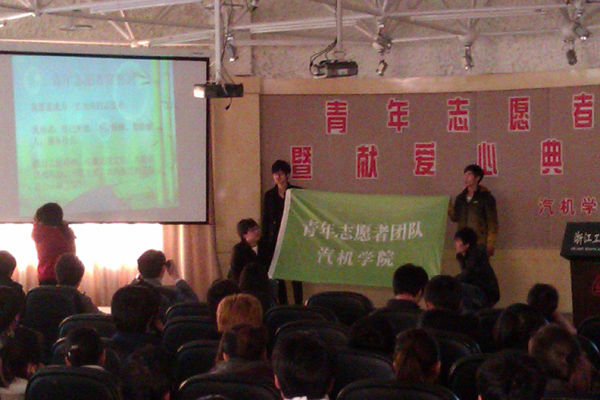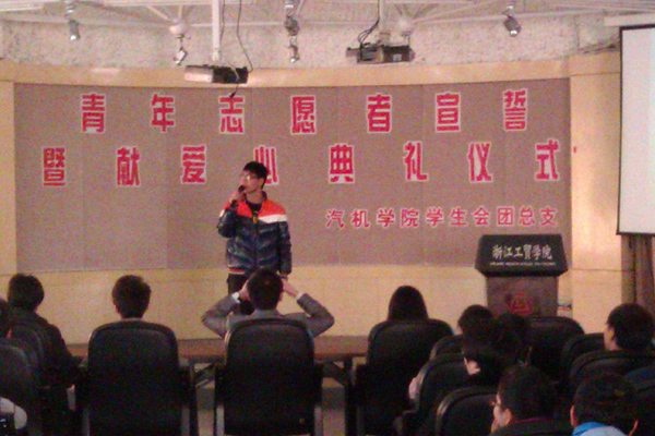 2011年12月10日下午,由汽机学院实践部举办的“青年志愿者宣誓仪式”在多功能厅成功举行。本次活动开始,由学生会主席孙嘉能发言,介绍青年志愿者的实质和精神,让我们进一步认识到作为一名青年志愿者是多么的光荣和幸运。其次,学生会各部门讲解ppt,向广大同学汇报各部门的工作内容。据悉技师学院一位同学患上严重疾病,我分院同学深表同情,并牵头号召广大汽机学生为他献出一份温暖。籍此机会,我们举行爱心募捐仪式,每班班长依次将本班的募捐款投入募捐箱中,这笔包涵了爱和温暖的善款将会在近期送达技师学院。最后,全体志愿者起立,面对志愿者旗,我们进行神圣的志愿者宣誓。在庄严的誓词中,同学们再次领会了志愿者精神并许下承诺。