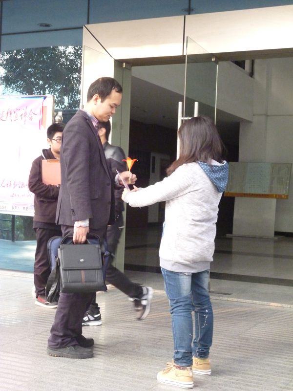 11月25日,院团委、学生会、学社联开展的“感恩你我他”行动在校园中悄悄展开。同学们自行组织在各个教学楼门口,等候着来上课的老师们,准备为辛勤上课的老师们送上一朵自己亲手制作的感恩之花,以此来表达对于老师的教育和培养的感谢之情。同学们的微笑、精致的花朵,温暖之情传递在老师和同学们的心间。