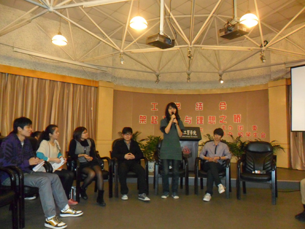 2011年11月16日晚,在我校的多功能厅举行了工学结合交流会。交流会上邀请到了经贸学院朱杨琼老师,和刚刚实习归来的轻工系方凯同学、电子系郑芝芝同学、以及信息学院黄连生同学与在场的观众一起分享了工学结合经历。大家围坐在一起,以一种沟通、坦诚、分享的融洽氛围展开了本次的交流会。