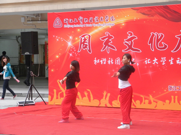 在首场周末文化广场上,学院的学生社团纷纷拿出自己的绝活。歌友俱乐部一首清新、悦人的《江南》让现场倍感清新;街舞社的《爵士》舞,精舞门的舞蹈《My.simple》,武术协会武术表演,带来了欢腾的气氛,协调的肢体运动、优美的舞姿,令人难忘,更令人意想不到是女生们的武术表演是有模有样,别具一番风味,赢得了现场观众的阵阵掌声。周末文化广场上演了魔术表演、茶艺表演。小品《谈判专家》、爱心联盟的手语表演《我们都一样》,赢得了在场观众喝彩声。除此之外,在表演的同时还展示了同学们手工艺设计大赛的作品,鞋艺协会也提供了精美的鞋品展示,更有PS高手现场为学院的宣传栏作图,设计工贸学院自己的校园文化。