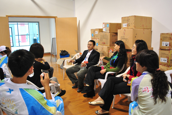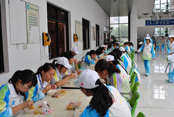 忙碌的工作虽然使得大家都疲惫不堪,但是没有人喊过一声苦。午间志愿者们利用吃饭的时间交流工作心得,传授工作技巧,认真、热忱的画面令人肃然起劲。