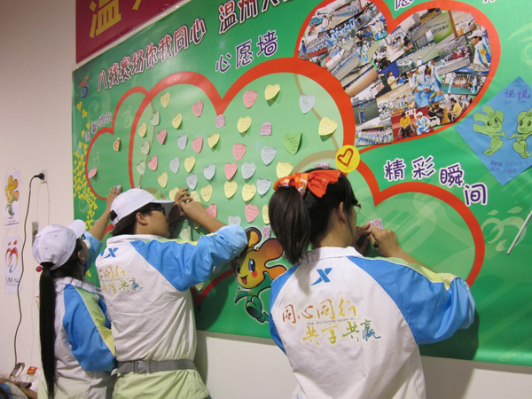 志愿者放弃休息、暂弃工作,来到赛场上无私奉献他们的青春,在他们的内心深处都有一个个关于爱和付出的故事。志愿者在休息室的“志愿者心愿墙”上,交流着爱的故事,鼓励彼此坚守内心最善良的心愿。