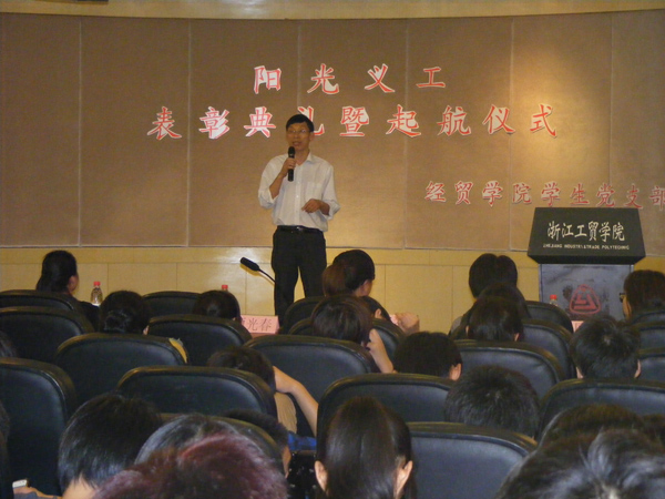 10月11日晚上,经贸学院学生党支部在学院多功能厅举办了“阳光义工表彰典礼暨起航仪式”活动,邀请了经贸学院党总支书记项光春、学生党支部书记郑秀、白福川、朱杨琼、叶丹丹以及辅导员向政和温州实艺幼儿园和温州小蜜蜂幼儿园的代表出席了本次活动。