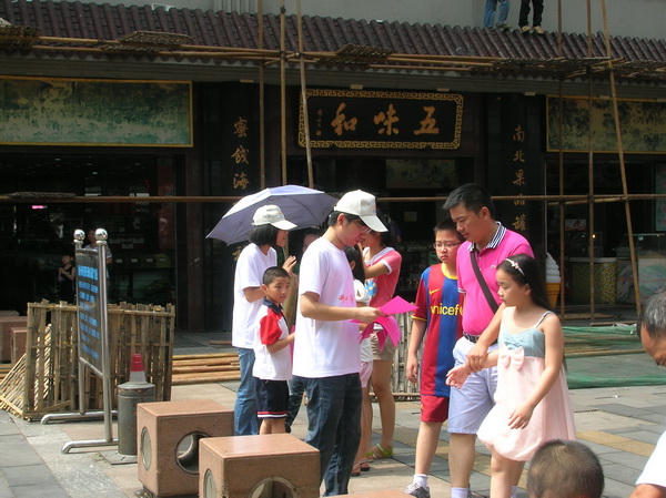 偶然的是我们在五马街的街道上巧遇到了温州医学院社会实践小组,他们实践内容是为贫困山区学生募捐。两个社会实践队伍,同样秉承服务社会、奉献群众的目地,两支队伍充分发挥了在温大学生的友好、团结精神,两个队伍互相帮忙,红色文化宣传,支持贫困地区教育发展,和谐奉献的画面得到了路人的赞扬。