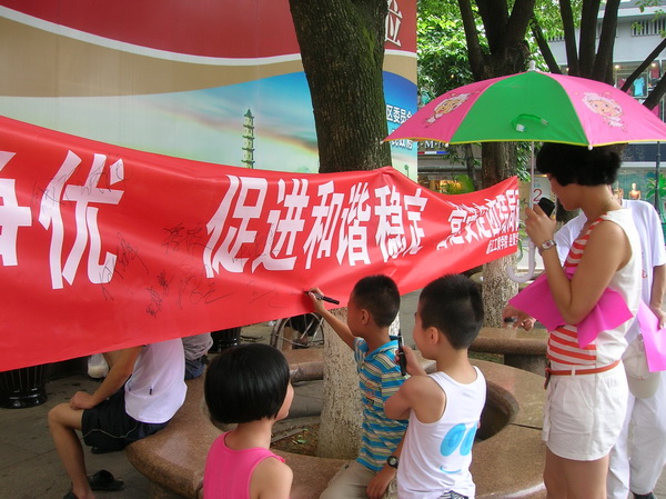 由于五马街的城管事先给予场地的协和支持,大家迅速的进入社会实践的主题。“创先争优,促进和谐稳定,营造安定团结局面”鲜红色的横幅悬挂在五马街口,同学们精心准备了宣传资料由队员发放传单和邀请路人来签名的初期,或者是因为不好意思;或者是对我们的活动不大了解,或者是队员们不怎么敢和路上的行人主动的交流行人常常拒绝我们的邀请。经过了一段时间的适应和协调,以及我们的对路人的耐心的解释,慢慢的越来越多的行人都参与到了我们的活动之中,还有些行人主动的来参与活动,这个活动进行的非常有序。街口队员们、老师脸上的笑容和汗水,成了一道独特的风景线。