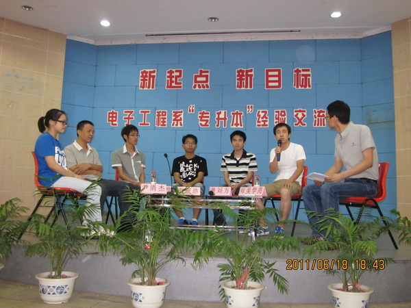为了帮助电子系学生了解“专升本”复习、报考等情况,并动员同学们积极为明年的“专升本”做好准备,引导良好的学风。6月18日晚上,电子工程系在我院阶梯教室举行“专升本”经验交流会。会议由电子工程系党总支副书记吴老师主持,特邀请人文系主任尹清杰老师、电子系专业课辅导班郑胜峰老师、电子系2011年考上本科的14名同学参加,电子系有意向参加“专升本”的09级、10级共有100多名同学和辅导员姜集苗老师也参加交流会。