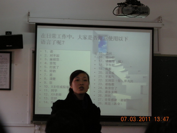 培训课上,黄老师由细节入手,紧紧围绕服务行业行为规范要求,结合高校后勤工作实际,重点从服务人员的仪容仪表、语言谈吐、礼貌用语、微笑、眼神、接听电话等方面向后勤员工进行了深入浅出地讲解。在授课过程中,黄老师还和后勤员工互动,进行了现场演练。日常工作中要学会使用“您好”、“请讲”、“欢迎”、“请稍候”、“麻烦您”、“打扰了”、“真抱歉”、“对不起”、“不客气”、“没关系”等28种文明常用语。特别在接听电话方面,黄老师特别强调:接通电话要主动自报姓名,语言清晰、耐心倾听,礼貌问候等等。黄老师的讲座通俗易懂、贴近实际、风趣幽默,引起了现场后勤员工的强烈共鸣,受到了大家的热烈欢迎。