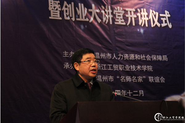 12月26下午,温州市“名师名家”牵手高校学子创业活动启动仪式暨创业大讲堂开讲仪式在我院举行。本次活动由温州市人力资源和社会保障局主办,我院和温州市“名师名家”联谊会承办。本土活动旨在通过结对温州市“名师名家”,提高我院大学生创业能力。市委组织部副部长、市人力资源和社会保障局局长陈进达,市人力资源和社会保障局副局长董旭辉,学院院长贺星岳及温州其他高校领导、温州市“名师名家”代表40人、我院创业学子等共180人参加了本次活动。