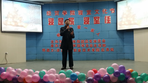12月25日,经贸学院“相‘寝’相爱一家人”寝室文化节活动在阶梯教室举行。经贸学院党总支书记项光春、总务处林彩云、团总支书记高莎、辅导员向政、周妍妍、郑雪琦等老师、团总支学生会及全体学生参加了此次活动。