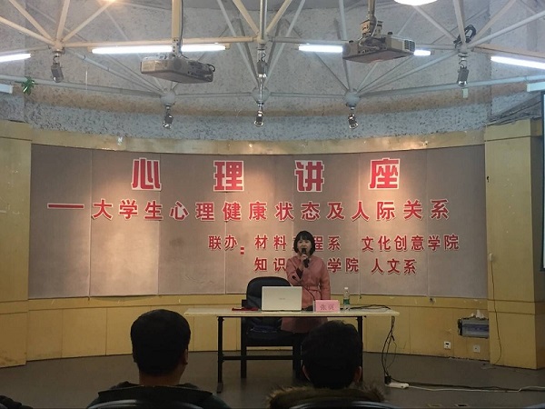 2015年12月9日晚,人文系、材料工程系、文化创意学院、知识产权学院在1号教学楼2楼多功能厅联合举办了心理讲座。本次讲座的主讲人是学生心理健康咨询中心的张页老师。此次讲座主要从大学生心理健康状况和大学生的人际关系这两个方面讲述高等院校学生的健康问题。