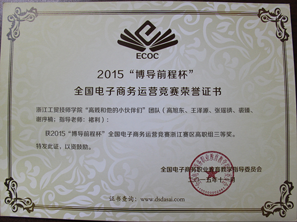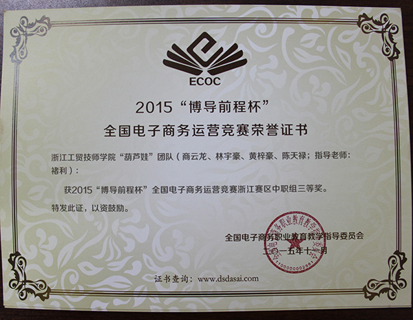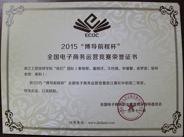2015年10月15日,由全国电子商务职业教育教学指导委员会主办,全国电子商务职业教育教学指导委员会秘书处承办的 “博导前程杯”全国电子商务运营大赛浙江赛区复赛在浙江经贸职业技术学院举行。技师学院(杭州校区)代表队在比赛中勇于拼搏,发挥出色, “我们” 团队获得中职二等奖;“动物园” 团队、“葫芦娃” 团队、“领导者” 团队、“秃鸡队” 团队获得中职三等奖;“奔牛” 团队、“高贱和他的小伙伴们” 团队获得高职三等奖。