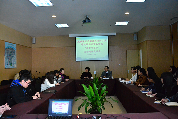 2015年11月27日,经贸学院与鹿城区五马街道 “新青年下乡”活动对接交流会在五马街道办事处第三会议室举行。经贸学院党总支书记项光春,五马街道宣传与统战委员陈迎芳,五马街道八个结对社区的代表,经贸学院辅导员高莎及对接班级各班级代表等参加了此次交流会。