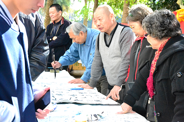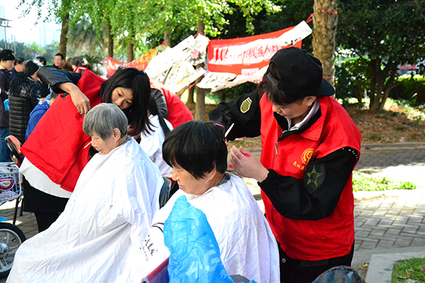 交流会后,经贸学院各班级学生代表马上前往八仙楼社区进行志愿服务。为社区老人免费理发、免费测量血压,为书法协会的成员们研磨铺纸,为瓯艺社的作品进行展示和宣传,为温州市首届妇女儿童文化艺术节进八仙楼社区做后勤服务并提供知识支持等。