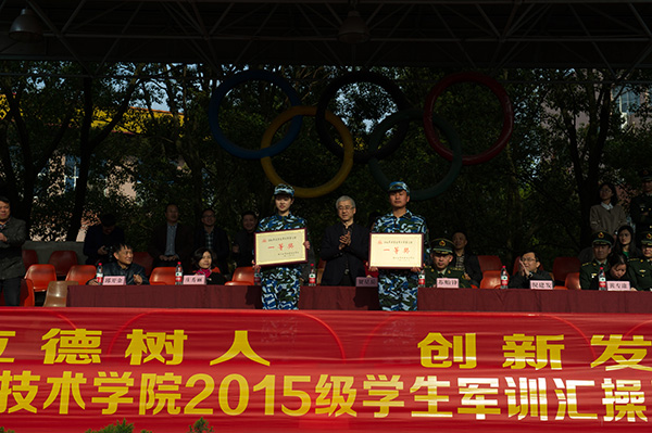 学院院长、党委副书记贺星岳作军训总结讲话,他肯定了所有参训人员辛勤的付出和取得的成果,向承训部队全体领导与教官表示衷心的感谢和敬意,向顺利完成军训任务的全体大一学生表示由衷的祝贺,并对2015级学生今后的学习生活提出了殷切的期望,希望全体同学在学习生活中继续发扬军训中培养出来的艰苦奋斗、顽强拼搏的精神,为实现自己的人生价值而不懈努力!最后,海警二大队苏贻锋大队长宣读了2016年军训汇操的各项成绩,与会领导为获奖方阵进行了颁奖。