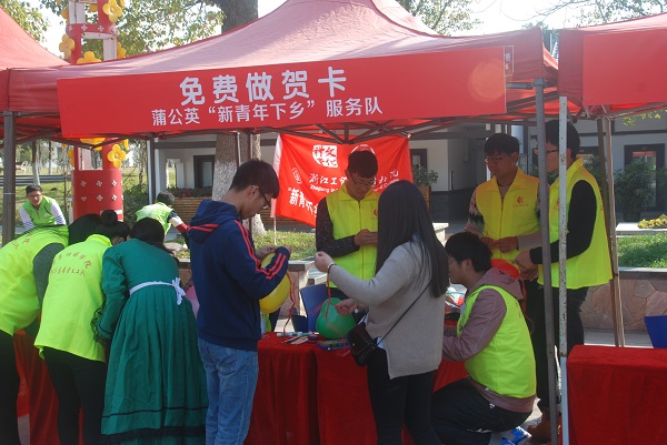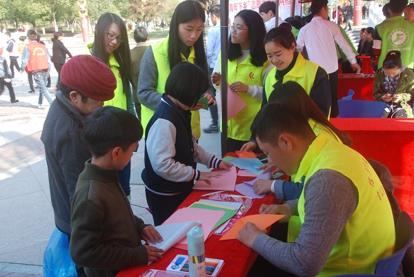清晨,那抹露珠还未退去,蒲公英志愿者团队们早已集结起来,拿着准备好的工具,向杨府山公园南大门出发。志愿者脸上洋溢着笑容,对这次活动更是跃跃欲试,迫不及待地想要融入到服务的团队中来。志愿者们到达了目的地后,男同学负责活动场地卫生与整理服务平台,女同学将事先准备好的工具整理出来,为这次的贺卡制作做准备。服务站边竖起了志愿者服务牌,吸引了很多孩子与家长,整个现场沸沸扬扬。活动中,志愿者细心地引导孩子们在生活中要提高审美观,“要提高动手能力、要爱家长、热爱生活、要从生活中发现美的价值”。女同学帮助孩子们构思贺卡效果,耐心地教授折纸鹤、爱心小纸团、纸青蛙等折纸艺术制作。男同学在边上帮助孩子们吹彩色气球、涂鸦彩色卡纸。家长们望着自家孩子在准备节日的礼物,欣喜中略带期望,当节日礼物被送到手中时,孩子与家长拉近了距离,幸福的气氛笼罩着周围。