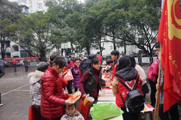现场来了许多小朋友、中老年居民。小朋友们对瓯绣瓯塑特别感兴趣,在志愿者的指导下参与制作自己的作品。老年朋友则对舞蹈、地掷球表现出兴趣,虽然没有正式的地掷球场地,但是我们还是开展了地掷球普及教学与体验,院团委派出地掷球全国冠军何丹同学给社区居民讲解地掷球规则,并教大家打掷球;舞蹈队的志愿者教老年朋友学集体舞,大家学得不亦乐乎。金融服务队的同学们为居民讲解新版百元人民币的辩别方法,还给百姓准备了180本2016台历挂历台历及猴年薄膜贴等喜气十足的春节礼物。老百姓拿到这些礼物后非常高兴,纷纷表示希望经常有这样的活动。