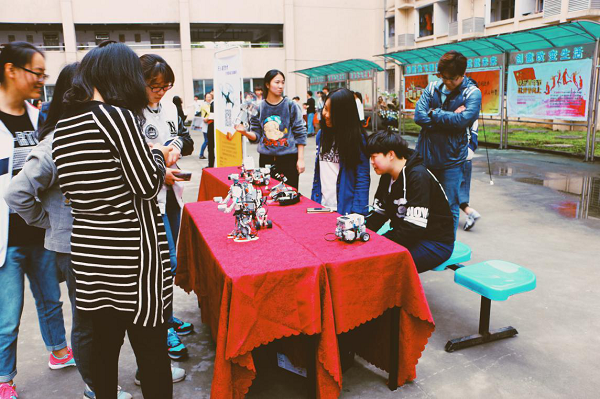 创客文化节上展出了我院成功创业学子的瓯塑作品和低碳环保创意工艺品;工贸工业设计创客工坊的木活字U盘;信息传媒学院的动漫作品;电子系的小型六轴飞行棋和风板控制装置;汽机系的乐高机器人;材料系的3D打印机,都吸引了众多同学的观看和试玩。