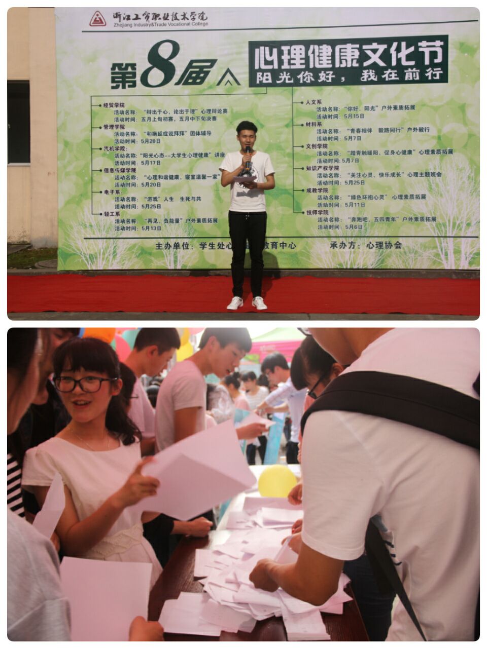 随着心理游园会的顺利召开,我院第八届大学生心理健康文化节正式开幕。本次心理健康文化节内容丰富,除了心理游园会,还有心理知识竞赛,“阳光进寝室”心理系列活动,手语大赛等,此外各分院(系)也都开展了各种主题的心理活动,一场盛大的心理盛典正式起航!