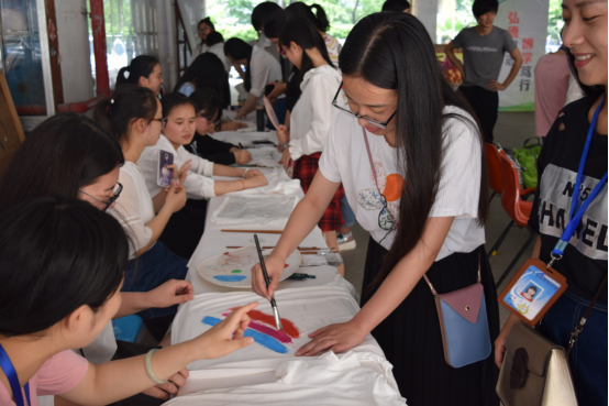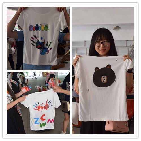 下午13:30,活动正式开始。随着音乐的响起,许多同学都参与到DIY活动中,纷纷动手开始创作。画笔在白衣上舞动,现场气氛热烈。虽然天气很热,但是同学们参与活动的热情不减,他们互相竞技,在轻快愉悦的音乐中,完成一幅幅绚丽的画作。白色的T恤上可爱的“叮当猫”、难过的“小丸子”、独特的“手掌印”等等栩栩如生。活动持续到下午6点,同学们迟迟不肯离去,意犹未尽。最后,我们现场拍摄、保留下那凝结着同学们创意的画作,并且将所筹集到的款项用来购买学习用品送给“爱心家教”活动的小朋友们。