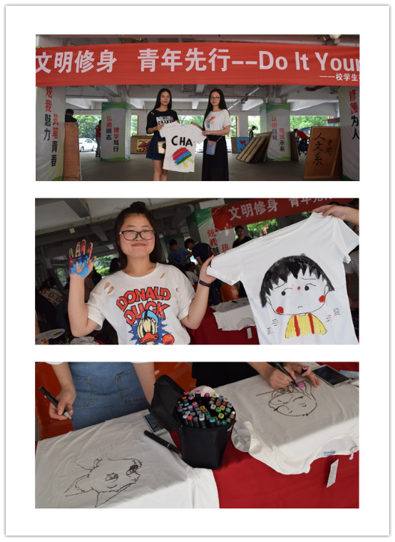 5月27日下午,由学生处(团委)主办、校学生社团联合会承办的“Do It Yourself”为主题的创意手绘T恤活动在学子广场成功举行。