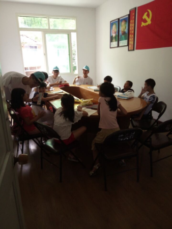 第二天一早,队员们刚吃完早饭,就有小朋友来了,看来孩子们的兴致还是很高的,同时也反映了此次宣传工作的十分成功,想来那张张写满大字的红色通知不是白写的,招新时的汗水也不是白流的。做完准备工作后,队员们便领着小朋友去当地的村名中心开始了暑期实践的第一课之旅,就在那里,留下了跟小朋友的第一张合照。