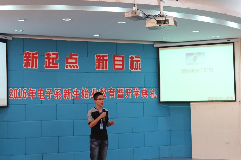 在电子信息研究院工作的电子系优秀毕业生毛显惯向新生展示了近几年“电子工匠坊”所取得的成果,并从“电子好玩的地方”“为什么去学电子”“怎么去学电子”等三个方面引导新生只要肯努力,一定能学有所长。短短的一个小时开学第一课,不仅拉近了新生和老师的距离,而且缩短了从高中生到大学生的转变时间。
