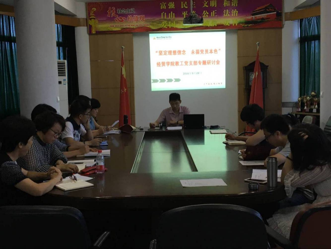 2016年9月28日下午,经贸学院教工党支部在一号教学楼六楼会议室召开全体党员会议,开展“坚定理想信念,永葆党员本色”专题研讨和党性、宗旨、作风“三问三查”活动,会议由教工党支部书记项光春主持,教工党支部全体党员参与。