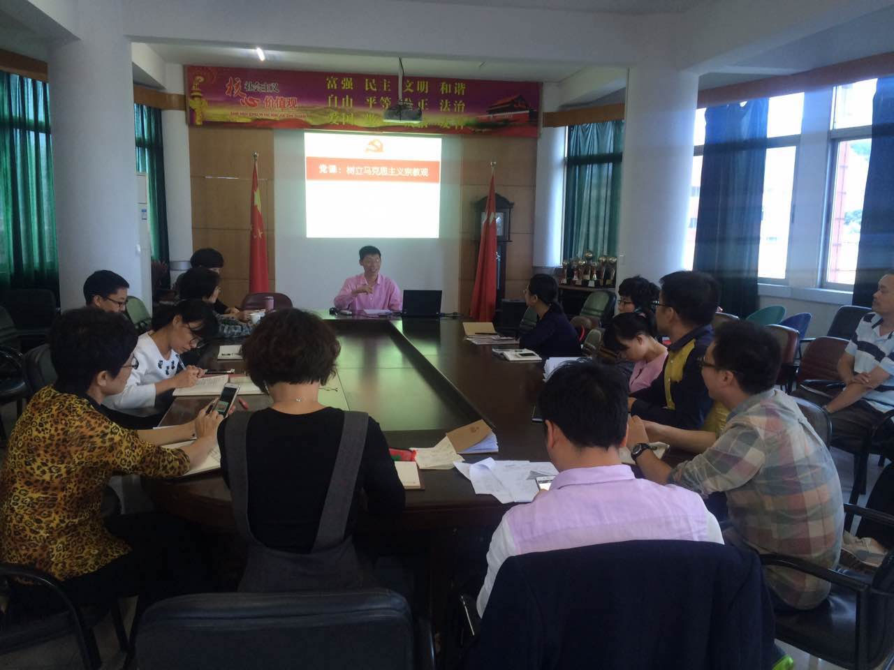 2016年10月12日下午,经贸学院党总支组织下属4个党支部的全体教职工党员在六楼会议室开展“树立马克思主义宗教观”的专题党课,党课由经贸学院党总支书记项光春主讲。