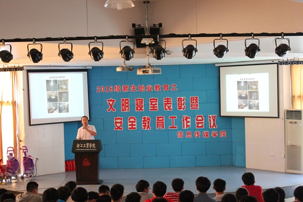 2016年10月13日中午,信息传媒学院在阶梯教室召开2016届新生文明寝室暨安全教育大会。主题围绕“寝室 安全 学风 礼貌”四个方面,会议由任志杰书记主持。