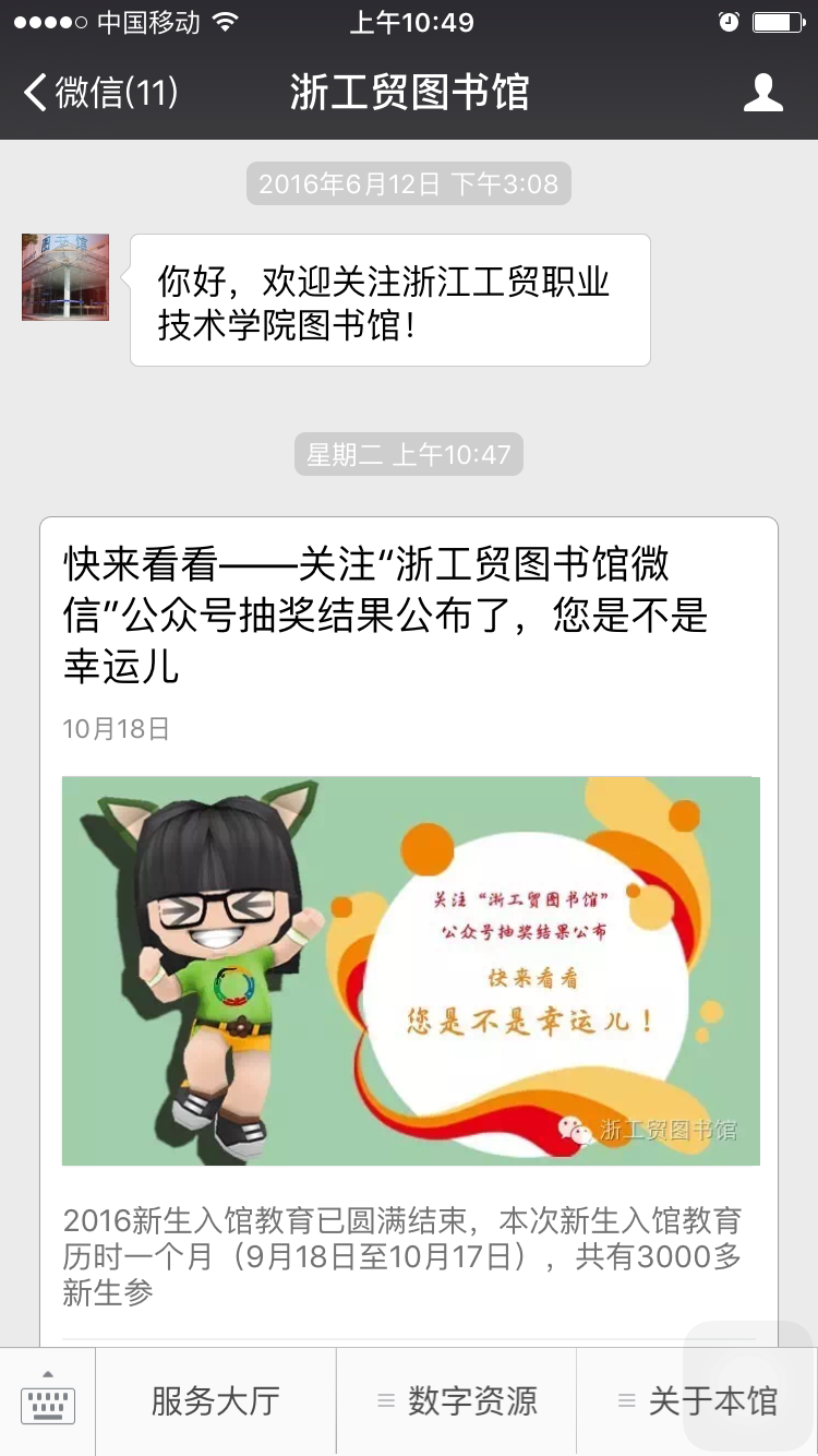 10月17日,图书馆对关注 “浙工贸图书馆”微信公众号的新生,开展了抽奖活动,从中产生了一等奖3名,二等奖8名,三等奖12名,并发放由书生之家、起点等数据商提供的奖品。