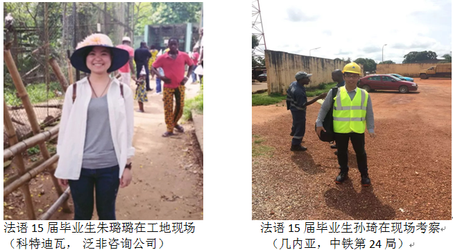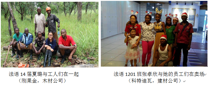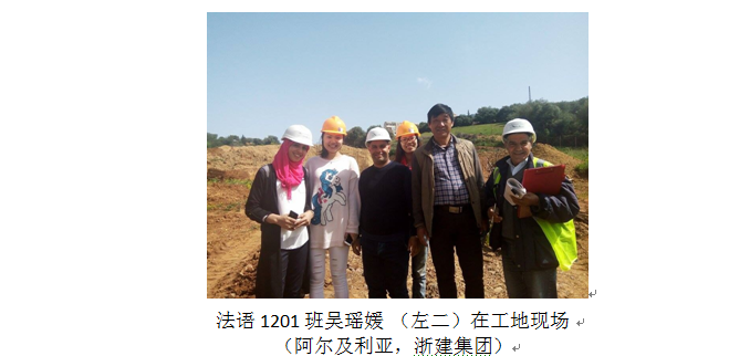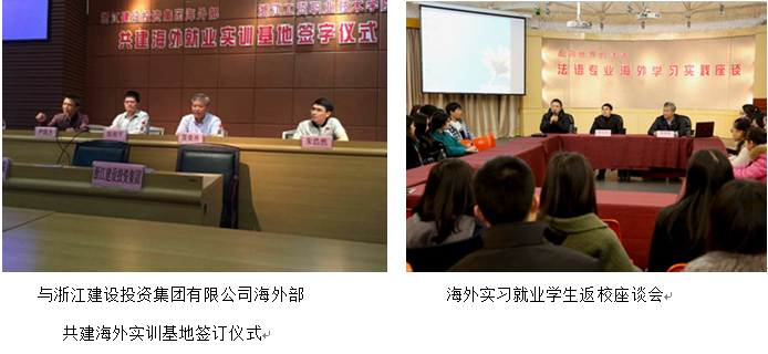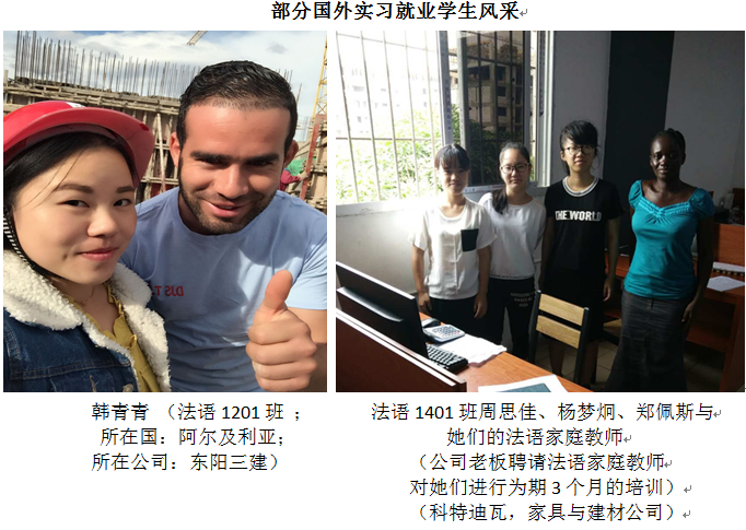 近年来,应用法语专业对教学模式、课程建设、学生招收、实训模式、毕业鉴定等诸多方面都进行了改革的同时,进一步拓展学生的实训实习及就业渠道,尤其是与海外中资企业积极联合建立工党结合实训基地和就业基地取得了丰硕的成果。目前,已先后与浙江省建设投资集团有限公司、中国河南国际合作集团有限公司、(科特迪瓦)泛非工程咨询公司签订了“校企合作共建海外实训基地”合作协议;与中国港湾工程有限责任公司、中铁二十四局集团有限公司、东阳三建、(中国)科特迪瓦建材及室内装修工程公司等建立了长期合作关系。近两年来,法语专业通过这些企业累计向国外派出了近30位法语专业毕业生或在校生(实训),前往阿尔及利亚、摩洛哥、吉布提、科特迪瓦、几内亚、刚果(金)、刚果(布)等国家工作就业或实习。这些学生在各自的岗位上充分发挥了所学专业技能优势,勤奋踏实,表现突出,受到了企业的一致好评。如法语1101班毕业生刘丛薇,曾任中国港湾吉布提项目部的行政总管,期满回国后,现应聘到法国雅高酒店集团杭州索菲特西湖大酒店担任主管;3+2法语1101班夏璐,在刚果(金)工作两年后,又成功应聘到中国能源建设集团刚果(金)项目部,年薪30多万元;2015届毕业生孙琦同学,曾被中铁二十四局集团海外部派往几内亚任常驻代表工作两年,现已顺利通过法语TCF考试,正办理赴法国留学深造手续;同届毕业生张孝欣同学在科特迪瓦的一家中资公司实习及工作一年多,得到充分认可,被任命为公司负责建材营销主管。目前,法语专业还有20余人在各个国家从事国际工程管理及语言应用工作。