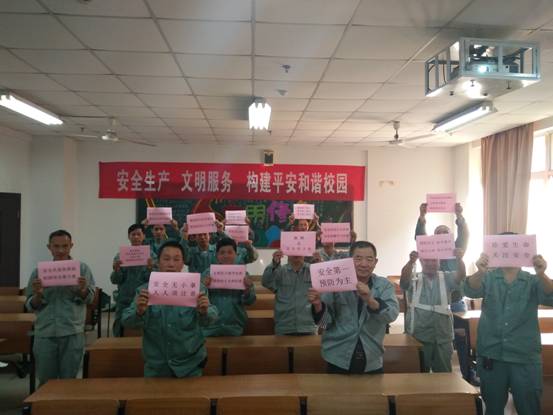4、说一句安全提醒语。“安全第一,预防为主”,“珍爱生命,关注安全”,“麻痹是安全的大敌”等等安全提醒语从员工的口出讲出,这些安全提醒语是总务处前期向各位后勤员工开始征集,员工从实际的作业过程中体会到的,校园学习生活中发现的。通过征集安全宣传语、说出安全提醒语,让员工深深感受到安全作业的重要性,同时通过展示让全体师生铭记校园安全的重要性。